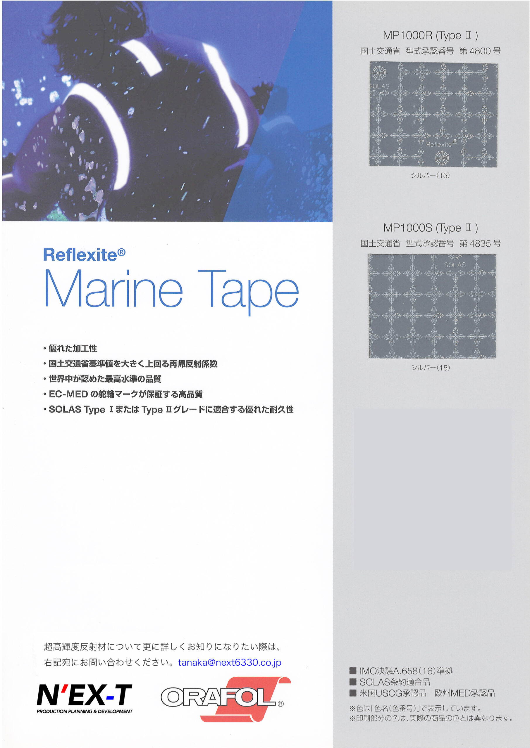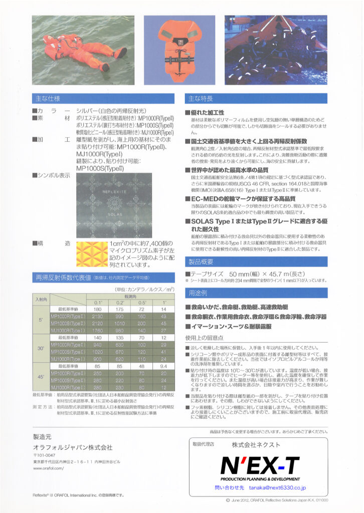 本製品は国土交通省の認証取得の海上・洋上用反射材です。水中でも「光が届けば」乱反射せず高輝度で反射しますので、作業用ベスト・救難用品・洋上で使用する物品等への使用をお勧めいたします。反射性能は世界最高峰1,000cd/luxとなります。