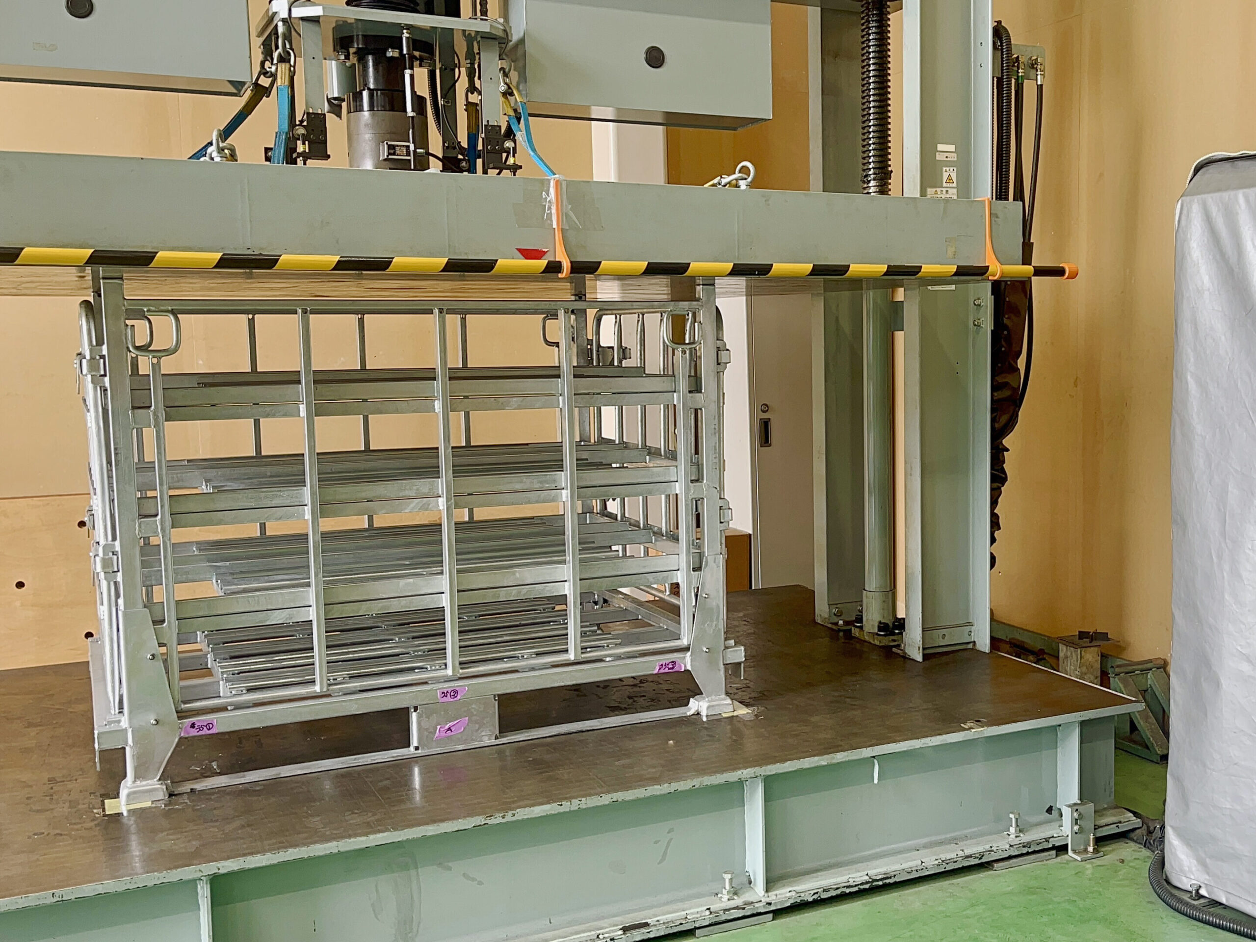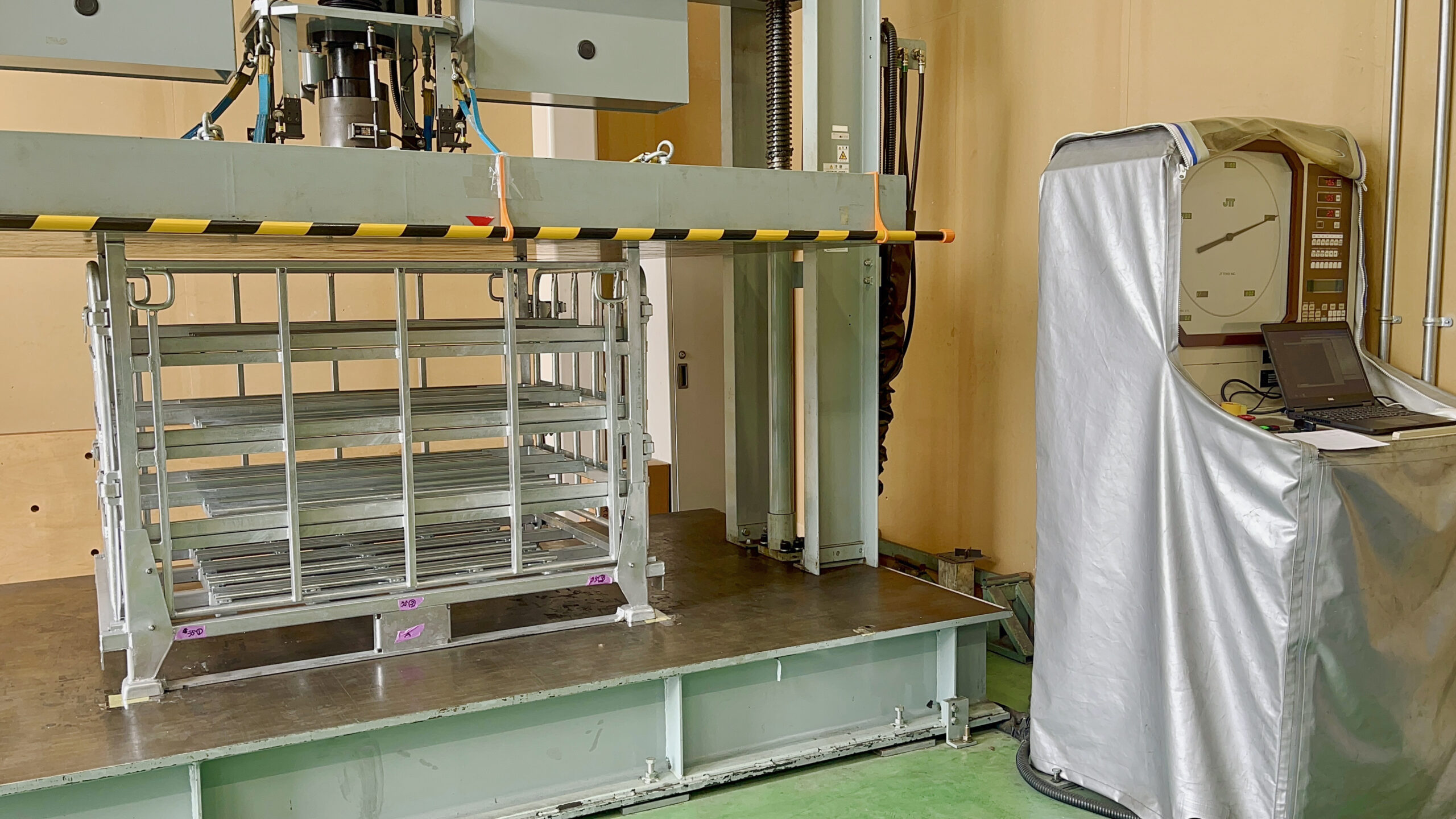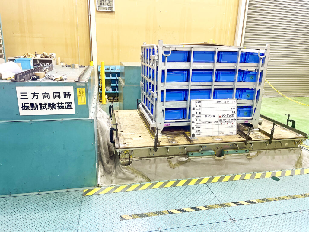 入庫した倉庫から場所を移して、物理的な試験も実施します。物理試験開始前に各部の寸法を確認。振動試験と荷重試験を実施しております。試験終了直後、各部の寸法変化を確認。試験結果は顧客要求レベルを超えており、安全に使用いただける物品であることが結果として出ております。試験対象は使用しても問題が無いと思われますが、廃棄処分となります。