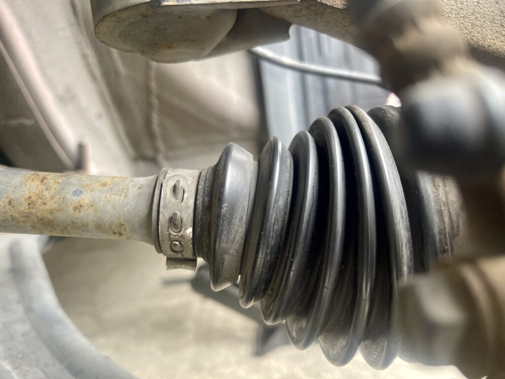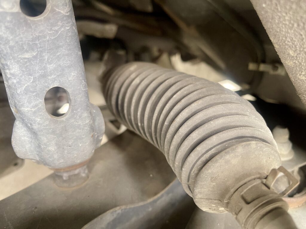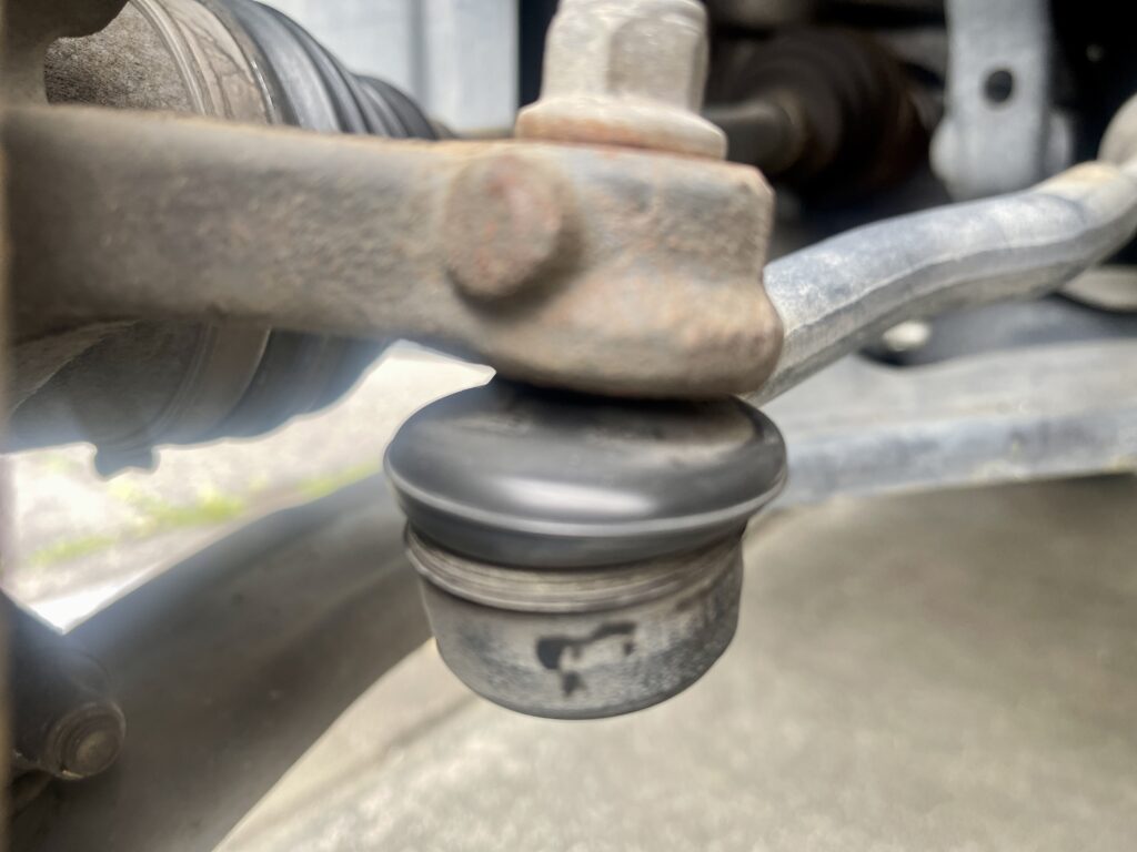 フロントホイール側から泥ハネのようなグリス飛散=ドライブシャフトのアウター側ブーツ破損を疑いましたが、ホイールの隙間から見てもグリスが出た痕跡は見えませんでした。もう一点、これは無いかな-と思いつつタイロッドエンドブーツも確認。異常は見られませんでした。